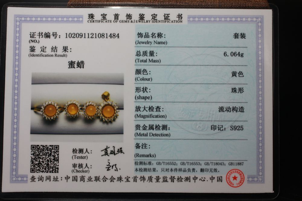 14 | 天然蓝珀吊坠、戒指、耳钉3件套 | 1 | 套 | 5.897g、内径戒指:17mm、耳环:8mm、项链:23mm |
